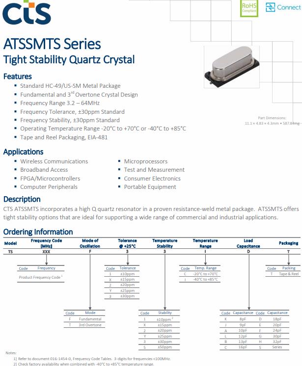 CTS晶振ATSSMTS,TS250F23CET無源晶體,CTS ATSSMTS在經過驗證的電阻焊接金屬封裝中集成了高Q石英諧振器。ATSSMTS提供緊密的穩定性選擇,是支持廣泛的商業和工業應用的理想選擇。