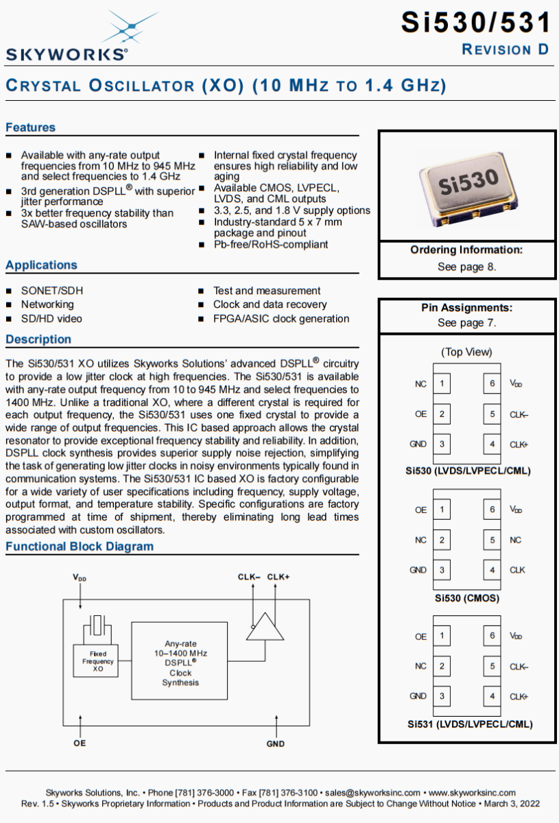 530BC187M500DG | Skyworks晶振 | Si530 | XO | 187.5 MHz | LVDS | 3.3V | ±7ppm |