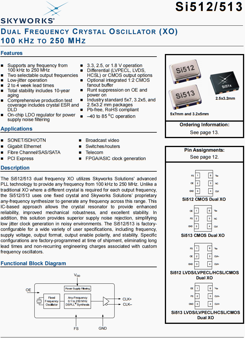 | 511BBA156M250AAG | Skyworks晶振 | Si511 | XO | 156.25 MHz | LVDS | 3.3V | ±25ppm |