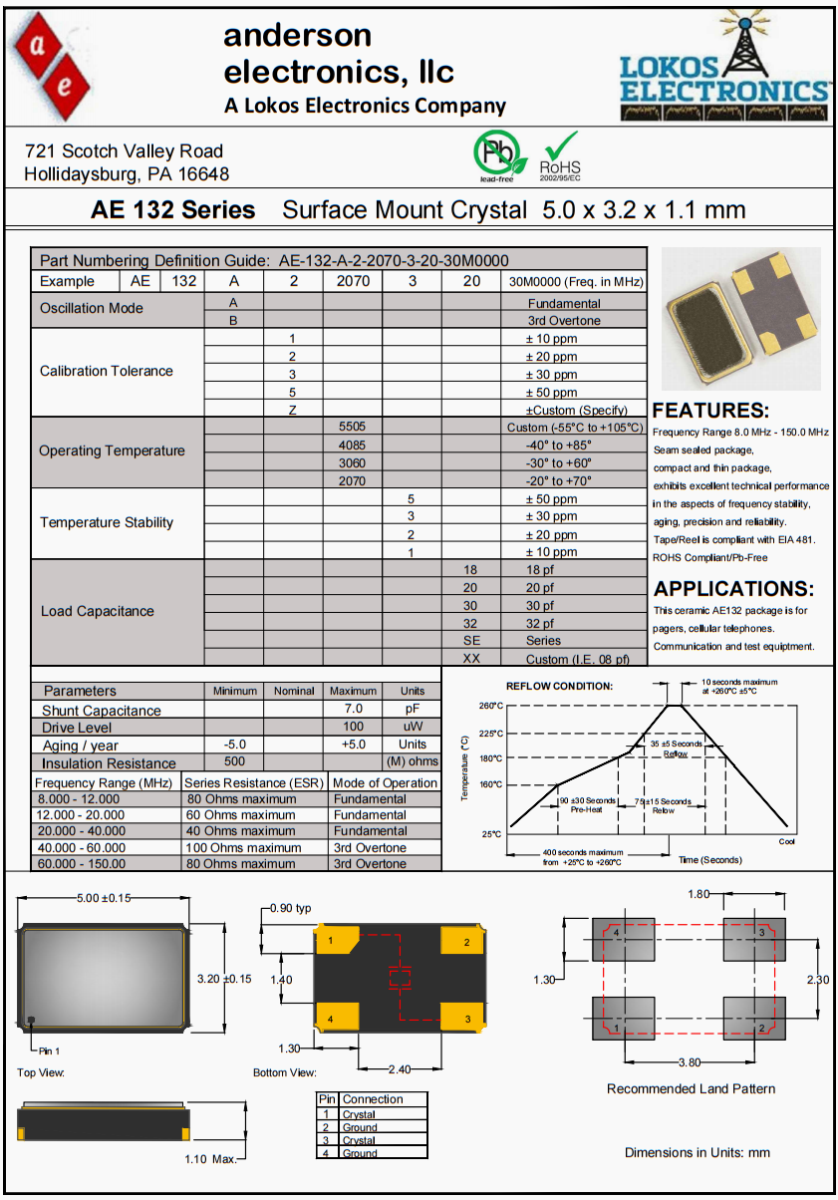 AE-132-A-1-4085-2-10-25M0000|AE132|25M|安德森,美國安德森晶振公司,Anderson晶振,AE-132晶振,AE-132-A-1-4085-2-10-25M0000晶振,5032晶振,高精度晶振,無源晶振,高品質晶振,美國晶振,進口晶振,低損耗晶振,高質量晶振,通訊設備晶振,路由器晶振,石英晶振,貼片晶振,產品具有高精度超小型的表面貼片型石英晶體振蕩器,最適用于移動通信終端的基準時鐘等移動通信領域.比如智能手機,無線通信,衛星導航,平臺基站等較高端的數碼產品,晶振本身小型,薄型具備各類移動通信的基準時鐘源用頻率,貼片晶振具有優良的電氣特性,耐環境性能適用于移動通信領域,滿足無鉛焊接的高溫回流溫度曲線要求,符合RoHS/無鉛。