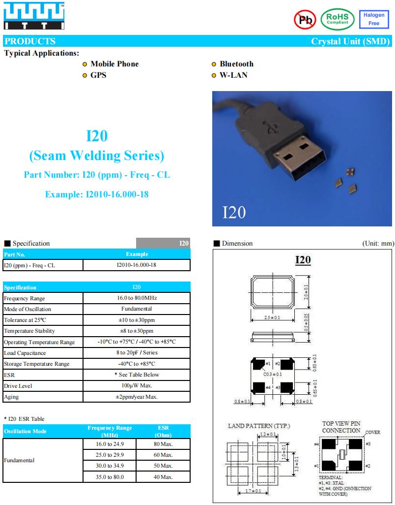 ITTI晶振,I20石英晶振,I2010-50.000-18,6G移動無線電晶振規格表
