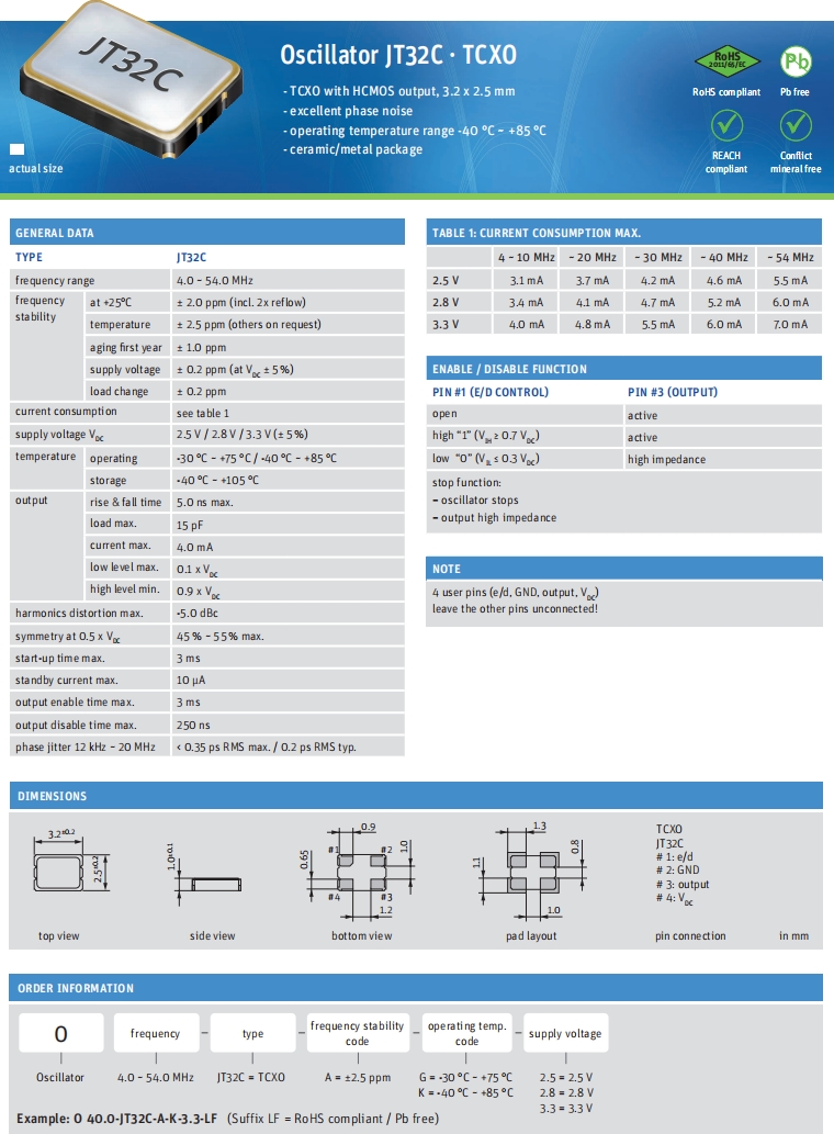 | Q 0.032768-JTX310-7-20-T2-HMR-LF | Jauch晶振 | JTX310 | 32.768kHz | ±20ppm | 7pF | -40°C ~ 105°C |