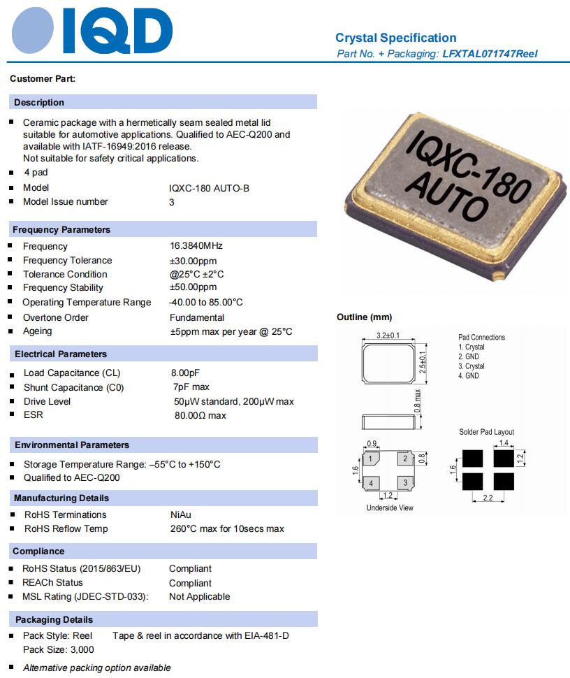 LFXTAL071747REEL|Resonator Crystal,歐美晶振,IQD晶振,IQXC-180AUTO進口晶振,LFXTAL071747REEL晶振,石英晶體,四腳貼片晶振,晶體諧振器,無源晶振,3225mm晶振,頻率16.384MHz,負載8pF,頻率容差30ppm,工作溫度-40~85°C,小體積晶振,耐高溫晶振,抗沖擊晶振,GPS導航設備晶振,信息娛樂系統晶振,環繞視圖攝像頭晶振,汽車音響控制器晶振.