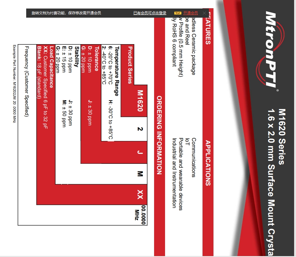 M1620|M1620 Series|MTRONPTI晶振 ,歐美進口晶振,。型號M1620,編碼M1620,精度范圍±10-±50PPM,頻率0MHZ,負(fù)載電容6-32PF,尺寸2016mm。工作溫度范圍:-40°C-85°C,四腳貼片,無源晶振,該產(chǎn)品輕薄,體積小,性能優(yōu)越,價格低,廉低損耗,高精度,高質(zhì)量,高品質(zhì)。適用于藍牙,無線通信,移動電話,GPS導(dǎo)航,車載導(dǎo)航,智能手機,通信和測試設(shè)備等其他IT產(chǎn)品的晶振應(yīng)用,三態(tài)功能,PC和LCDM等高端數(shù)碼領(lǐng)域。