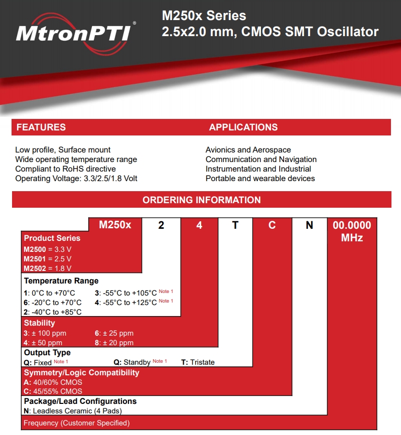 MTRONPTI晶振規格 單位 M250x晶振 石英晶振基本條件