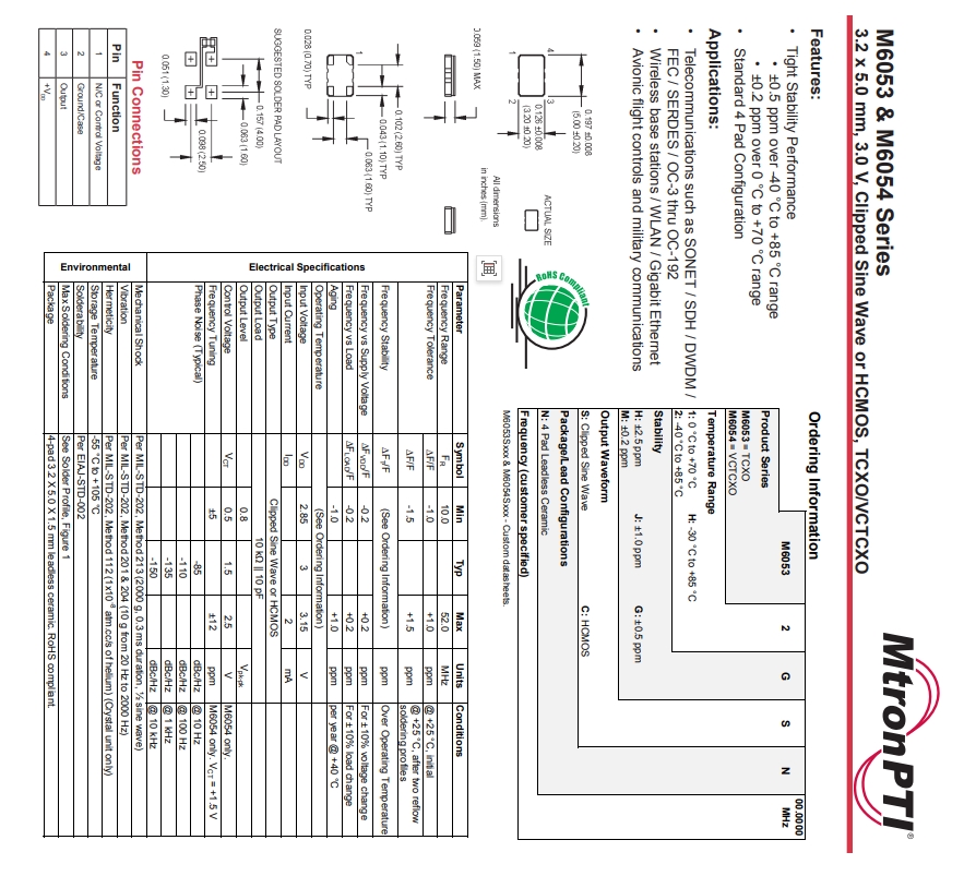 | M6054S006 50.000000 | M6053 and M6054 | ±2 ppm | 50 | 3.2 X 5.0 mm | -10°C - +85°C | 3 |