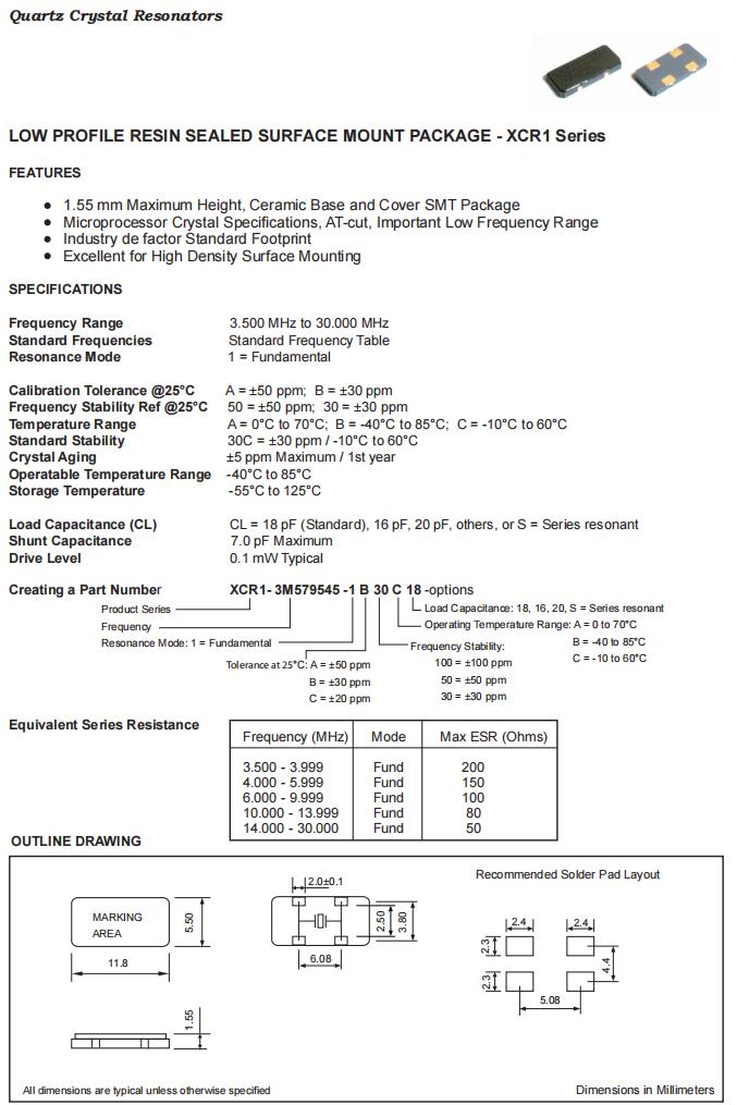 XCR1-3M579545-1B30C16|3.579545MHz|16pF|Fortiming晶體規格表