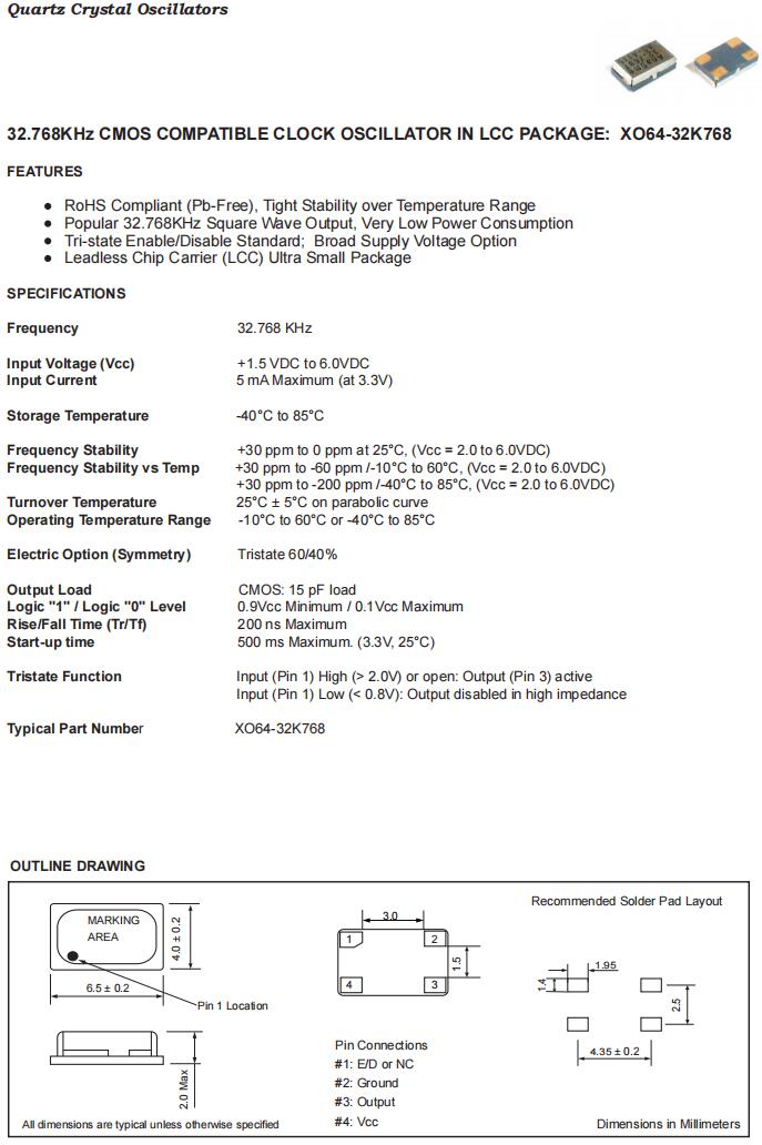 XO64-32K768-B30B3|32.768KHz|3.3V|富通時(shí)鐘振蕩器,富通晶振,XO64-32K768時(shí)鐘振蕩器,有源晶振,XO64-32K768-B30B3晶振,石英晶體,6.5×4.0mm晶振,四腳貼片晶振,SMD晶體,頻率32.768KHz,電壓3.3V,頻率穩(wěn)定性30ppm,工作溫度-40~85°C,低功耗晶振,高穩(wěn)定性晶振,高品質(zhì)晶振,微處理器時(shí)鐘晶振,COTS網(wǎng)絡(luò)設(shè)備晶振,以太網(wǎng)晶振,數(shù)據(jù)中心晶振.