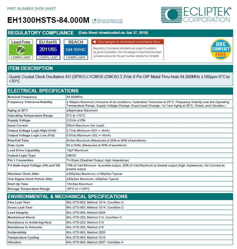 EH1300HSTS-84.000M|晶振|有源晶振,物料編碼EH1300HSTS-84.000M,頻率84MHZ,精度±100ppm,負載電容15PF,電壓3.3V,尺寸:4-pin Metal DIP,溫度范圍:0℃-70℃, 輸出LVCMOS 60%,有源晶振,SPXO振蕩器,ECLIPTEK晶振,差分晶振,歐美晶振,晶振,石英晶振,特點:輕薄小,低電源電壓,低差損,低功耗,應用于衛星發射塔,微型攝像頭,數碼相機,機械鐘表,智能手機,智能游戲機等.