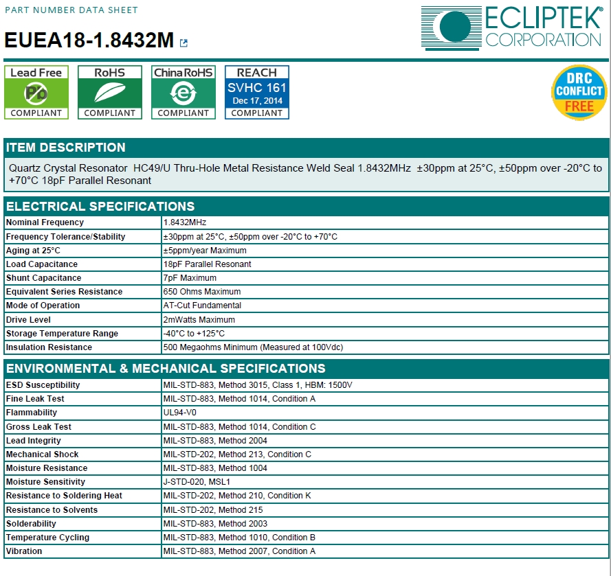 EUEA18-1.8432M|1.8432MHz|無源晶振,物料編碼EUEA18-1.8432M,頻率1.8432MHZ,精度±30ppm,負載電容18PF,尺寸:2-Pin HC-49/U,溫度范圍:-20℃-70℃,無源晶振,ECLIPTEK晶振,歐美晶振,插件晶振,石英晶振,應用于MP3,MP4,PM5,錄音筆,藍牙耳機,U盤,網卡,USB轉接器等.