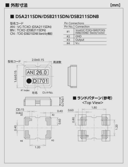 KDS晶振,DSA211SDN晶振,2016mm晶振,KDS晶振性能穩定,精度高,體積小,在惡劣環境也能正常工作,TCXO溫補晶振溫度穩定度可達±0.5PPM.在普通晶體諧振器和振蕩器中,我們可接受高頻率和偏頻率以及少數量的高精度寬溫的制作. 具有最適合于移動通信設備用途的高穩定的頻率溫度特性.為對應低電源電壓的產品.(可對應DC +1.8 V±0.1 V to +3.2 V±0.1 V )高度:最高1.0 mm,體積:0.007 cm3,重量:0.024g,超小型,輕型.低消耗電流,表面貼片型晶振產品.(可對應回流焊) 無鉛產品.滿足無鉛焊接的回流溫度曲線要求.