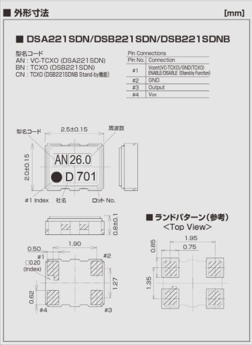 KDS晶振,DSA221SDN晶振,2520mm晶振,頻率范圍:19.2MHz/26MHz/38.4MHz/40MHz/52MHz,厚度2.5 × 2.0 × 0.8mm,應用于:無線通信設備.