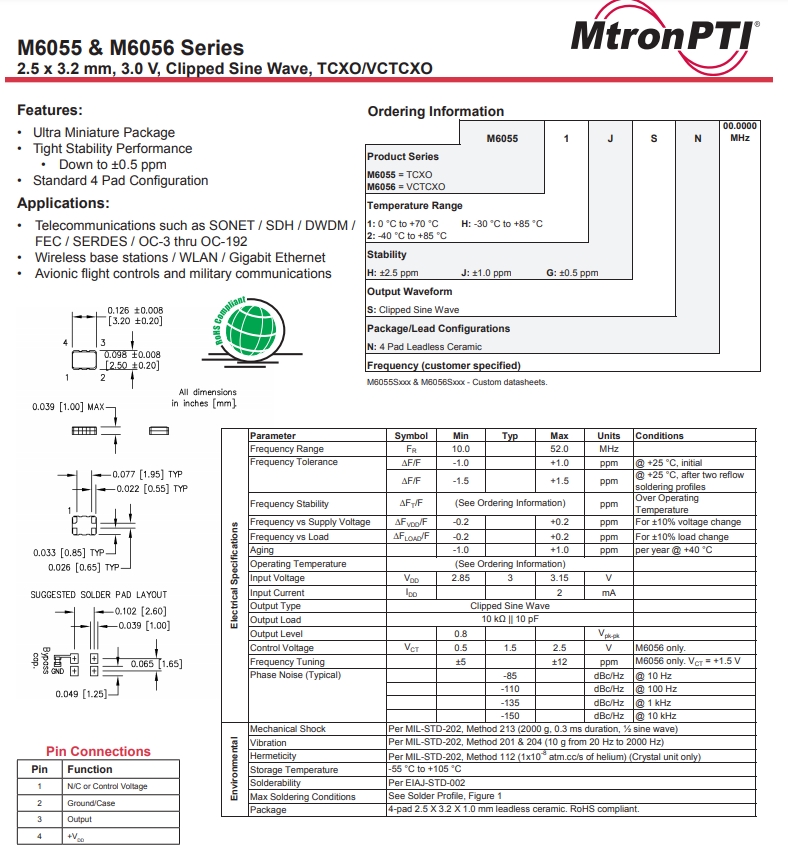 | M6055S010 24.000000 | M6055 and M6056 | TCXO | ±2.0 ppm | 24 | 2.5 X 3.2 mm | -40?C to +85?C | 3.3 |