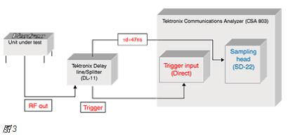 被測單元的輸出被饋入分路器/延遲線。分路器的非延遲輸出被饋送到示波器的外部觸發輸入(在這種情況下為CSA-803)。DL-11的延遲輸出連接到示波器的輸入。通過在觸發器之后一次檢查時鐘流等于所使用的延遲(在這種情況下,47納秒),觸發邊緣被定位。在識別出觸發邊緣之后,檢查下一個邊緣。然后產生測量的第二邊緣抖動的直方圖。