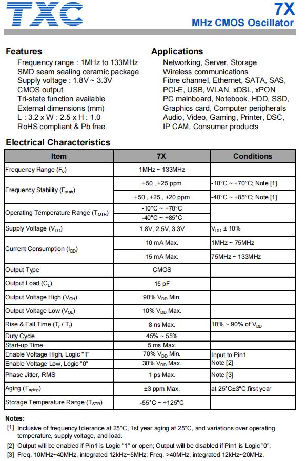 | 7X-20.000MCB-T | TXC有源晶振 | 7X | XO (Standard) | 20MHz | ±50ppm | -10°C ~ 70°C |