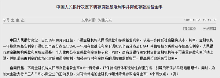 周五(10月23日)北京時間晚間,中國人民銀行官網宣布雙降,為繼8月26日雙降以來第二次雙降。中國人民銀行決定,自2015年10月24日起,下調金融機構人民幣貸款和存款基準利率,以進一步降低社會融資成本。其中,金融機構一年期貸款基準利率下調0.25個百分點至4.35%;一年期存款基準利率下調0.25個百分點至1.5%;其他各檔次貸款及存款基準利率、人民銀行對金融機構貸款利率相應調整;個人住房公積金貸款利率保持不變。同時,對商業銀行和農村合作金融機構等不再設置存款利率浮動上限,并抓緊完善利率的市場化形成和調控機制,加強央行對利率體系的調控和監督指導,提高貨幣政策傳導效率。