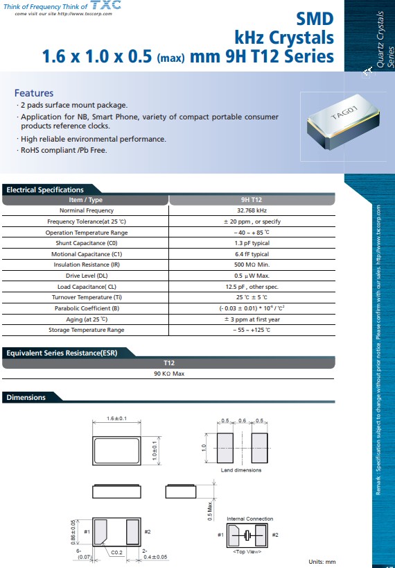 TXC晶振生產(chǎn)的SMD kHz晶體,9HT12系列,頻率32.768k晶振,超小型晶振尺寸1.6x1.0x0.5mm表面貼裝封裝,兩腳貼片晶振,晶體諧振器,具有超小型,輕薄型,耐熱性,高可靠的環(huán)境性能,符合RoHS標(biāo)準(zhǔn)/無鉛,適用于筆記本電腦、智能手機、各種小型便攜式消費電子產(chǎn)品,參考時鐘,實時時鐘應(yīng)用等