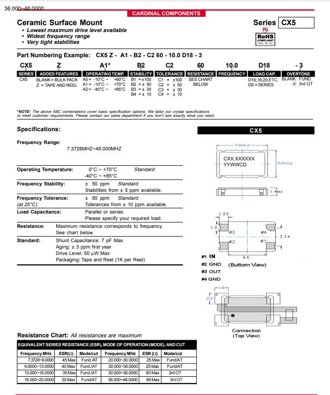 CX5Z-A1B2C5-40-24.0D18 | Cardinal晶振 | CX5 | 24MHz | ±50ppm | CRYSTAL 24.0000MHZ 18PF SMD |