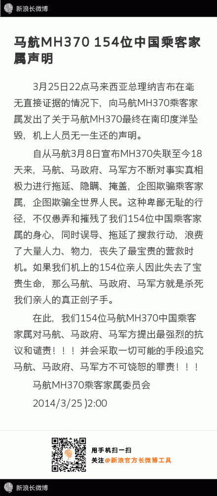 只要手機(jī)里面的32.768K晶振能有供電功能,就會(huì)被用來啟動(dòng)GPS芯片,并打開無線電發(fā)送當(dāng)前坐標(biāo)。那么這么先進(jìn)的技術(shù),為什么沒有用在馬航事件。馬航始終帶給我們太多的疑問。以至于馬航家屬一再譴責(zé)馬航官方和軍方。以下是馬航家屬的譴責(zé)信。