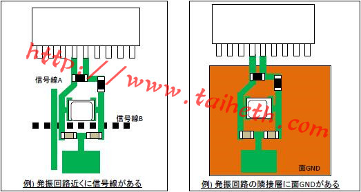 另外,當用接地圖案圍繞振蕩電路圖案作為EMI的對策時,如果振蕩電路圖案和接地圖案彼此非常接近,剛寄生電容將增加并且因此負電阻將減小,所以應當小心.