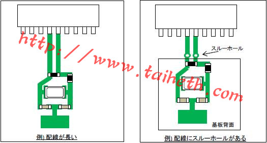 請注意不要在布置振蕩電路的區域中間層放置表面接地或者信號圖案,特別是在多層板或柔性板的情況下.當接地和振蕩電路之間的寄生電容變大時,接地或者信號路徑不應位于多層電路板的中間層與振蕩電路重疊.由于振蕩裕度不足,大的雜散電容可能導致振蕩停止,們于C-MOS逆變器輸入附近的信號路徑可能會產生EMI,因為波形中的噪聲被放大.振蕩電路和表面接地重疊的區域和它們之間的層越窄,振蕩器電路的寄生電容越大,這導致振蕩器電路的負電阻減小,并且石英晶體振蕩器故障的可能性也會隨之增加.對于信號模式,特別是當它靠近振蕩電路的輸入側時,信號疊加在振蕩波形上變成噪聲,該噪聲被放大并出現在振蕩電路的輸出側,極度引起EMI.
