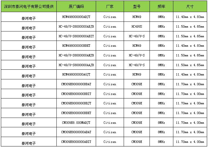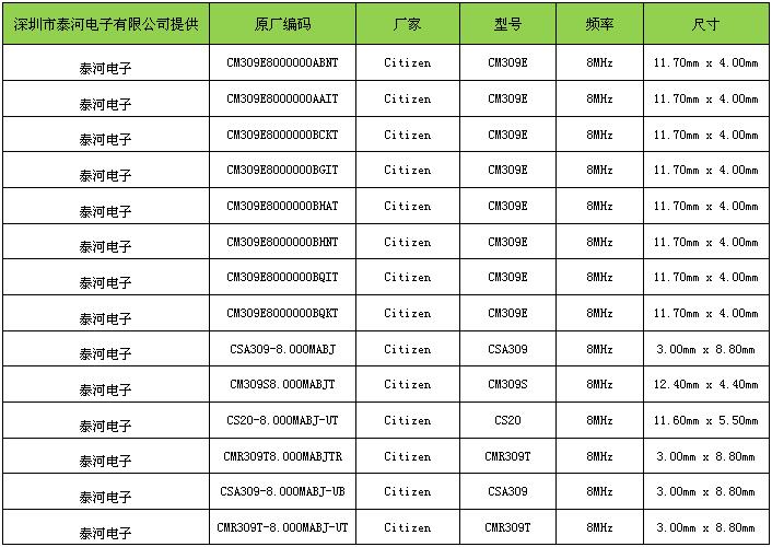西鐵城晶振公司的產品型號有很多,大家都知道每個料號都擁有許多種規格,無源晶振最主要的幾大參數分別是封裝尺寸、頻率范圍、ppm精度,pF負載電容和溫度特性范圍等。其中最重要的一項參數是每顆晶振的頻率,8.000MHz是這個行業里最常見,也是被各個用戶廣泛使用的一種晶振頻率,這個頻點的石英晶體,日本西鐵城公司的型號和規格有很多,泰河電子這期為大家分享的就是西鐵城晶振公司8M的原廠編碼和對應的參數。