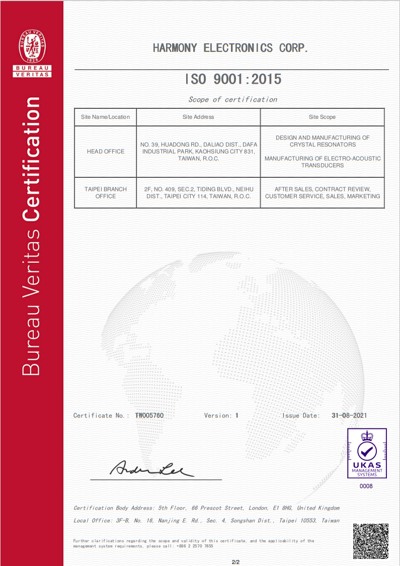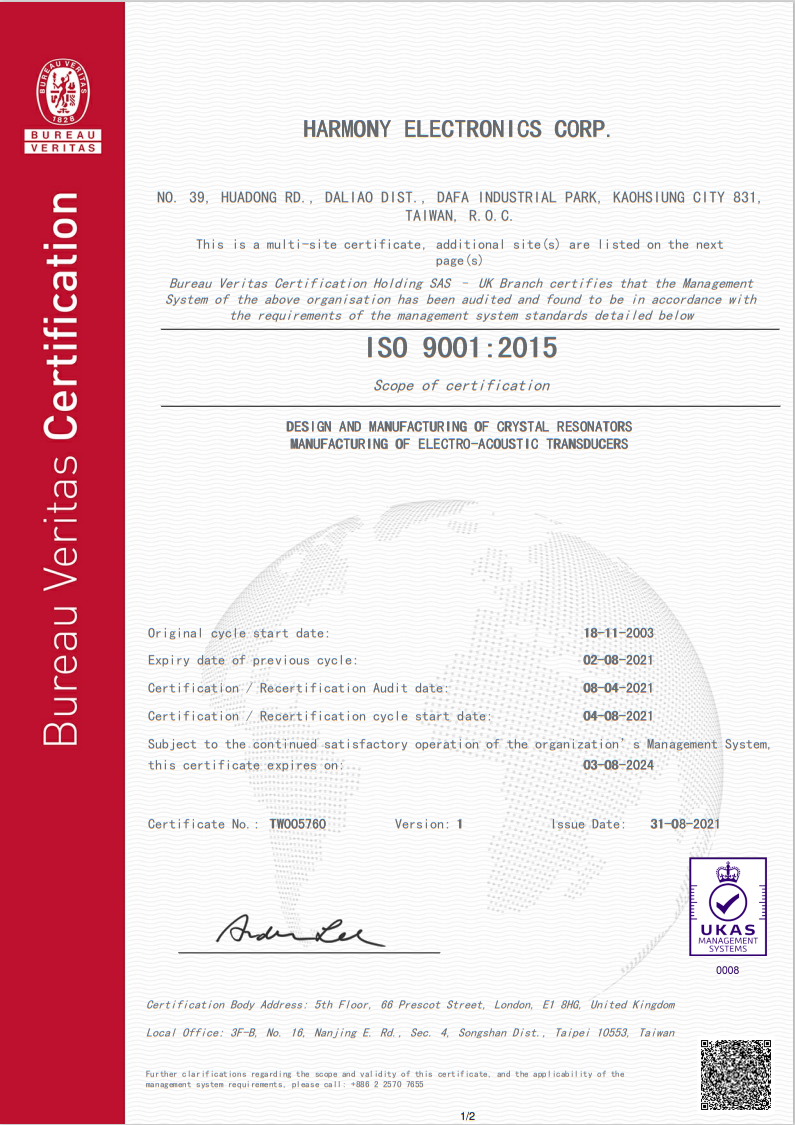 臺灣加高晶振公司通過ISO 9001:2015認證,X1H024576DK1H-X晶振,必維國際檢驗集團認證控股公司SAS – 英國分公司證明管理層上述組織的系統已經過審核,晶體諧振器的設計和制造符合管理體系標準的要求,詳述如下