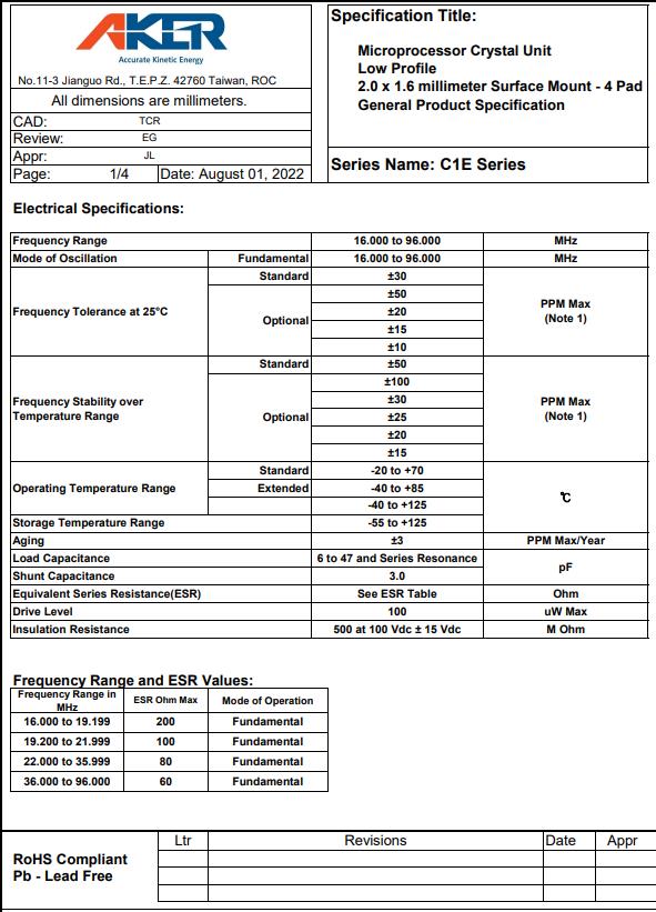 AKER Crystal|C1E-20.000-8-3050-X1-R|2016mm,AKER晶振,C1E無源晶振,進口石英晶振,C1E-20.000-8-3050-X1-R晶振,2016mm晶振,四腳貼片晶振,頻率20MHz,負載8pF,頻率容差30ppm,工作溫度-40~125°C,無鉛環保晶振,耐高溫晶振,超小型晶振,GPS導航系統晶振,汽車控制模塊晶振,動力系統晶振,遠程信息處理晶振.