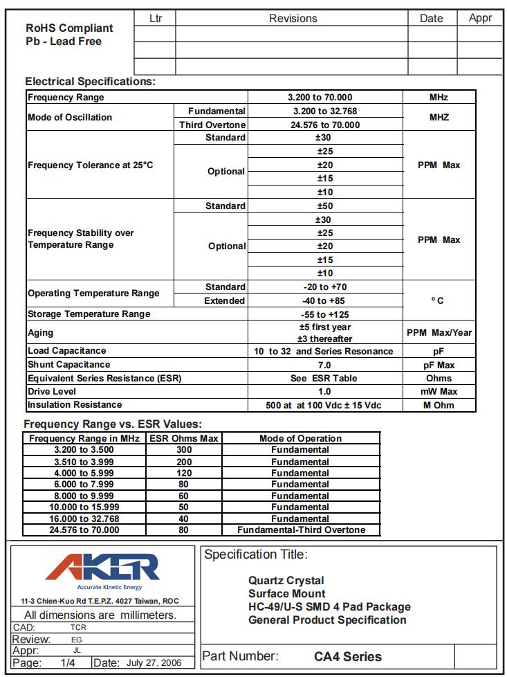 CA4-26.000-18-2030-X-R|26MHz|18pF|臺灣安基晶振,臺灣安基晶振,AKER晶振,CA4無源晶振,CA4-26.000-18-2030-X-R晶振,HC-49/U-S晶振,石英晶體諧振器,四腳貼片晶振,SMD晶振,頻率26MHz,負載18pF,頻率容差20ppm,工作溫度-40~85°C,無鉛環保晶振,低老化晶振,高可靠性晶振,投影儀專用晶振,智能家居應用晶振,儀器設備專用晶振,電子體重秤晶振.