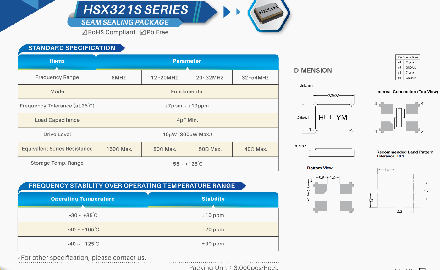 | X3S024000B91H-V | 加高晶振 | HSX321S | 24 MHz | ±10ppm | ±10ppm | 9pF | -10°C ~ 60°C |
