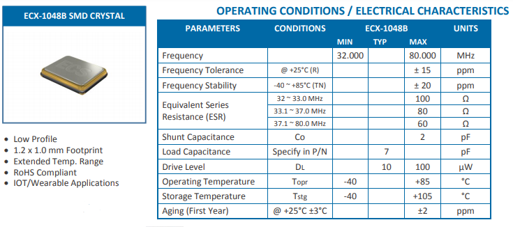 越小型的ECX-1048B晶振是ECS Inc最小巧的緊湊型石英晶振.尺寸僅為1.2*1.0*0.33mm,陶瓷封裝頻率可從32.000MHZ到80.000MHZ,在25度下頻率偏差可達+-15PPM,在高溫-40~+85度的情況下頻率穩定度仍可達+-20ppm.負載電容常用的是7PF,聯系我們可以根據所需要求訂制相同參數產品.