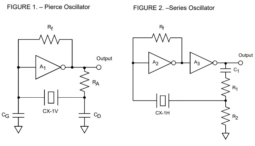 Generally a series oscillator (Figure 2) consists of two cascaded inverters with the crystal connected between the second inverter output and the first inverter input. The crystal behaves electrically as though it were a capacitor. The oscillator will usually free-run at a higher frequency if the crystal is removed. Compared to the pierce oscillator, it starts faster (typically 100 milliseconds) and draws higher current.