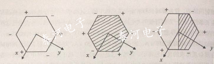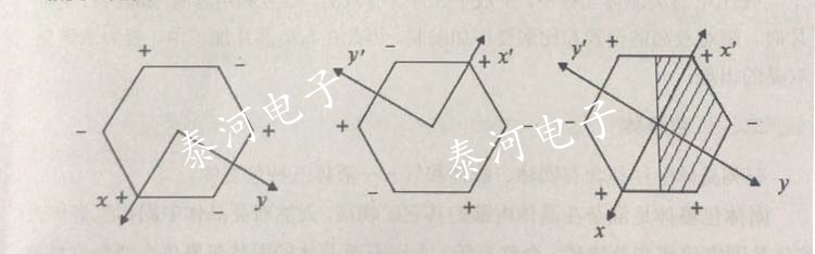 (a)左旋石英晶體的極性;(b)右旋石英晶體的極性;(c)光雙晶的極性;