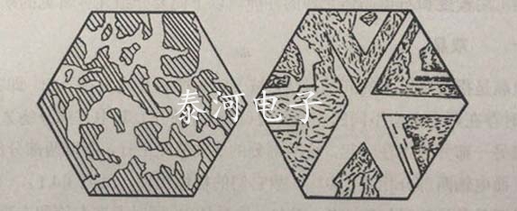 電雙晶又稱道芬雙晶;光雙晶又稱巴西雙晶。雙晶的邊界可用氫氟酸腐蝕顯示出來(見圖1.4.3)。雙晶多出現在天然石英晶體中,但在石英晶片加工中也會誘發出雙晶。例如:石英晶片加熱溫度超過573℃,或雖然不超過573°C,但石英片內部溫度梯度太大,都可能產生電雙晶;又如:晶片研磨時,由于機械應力的作用,可能產生微小的道芬雙晶。